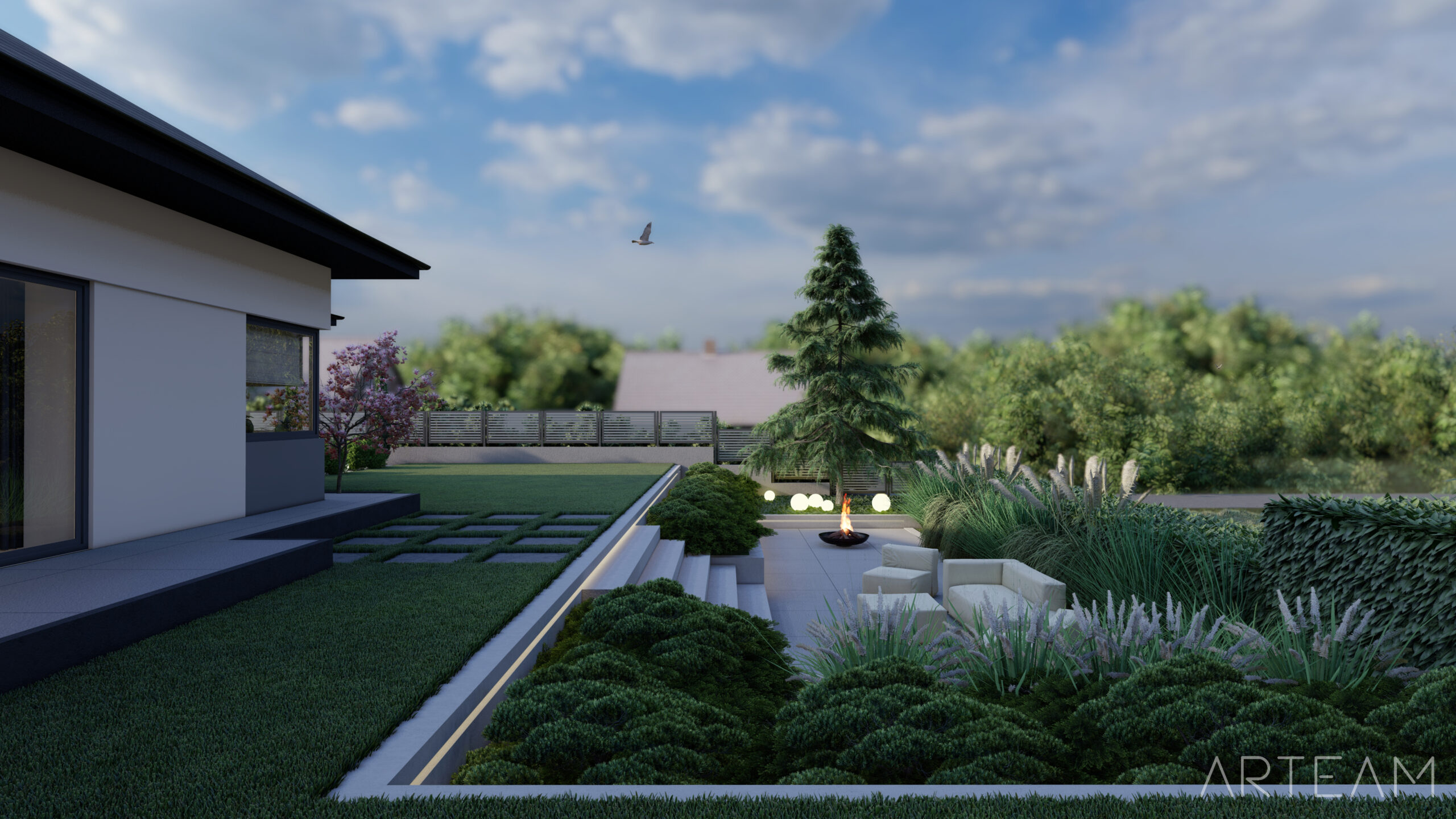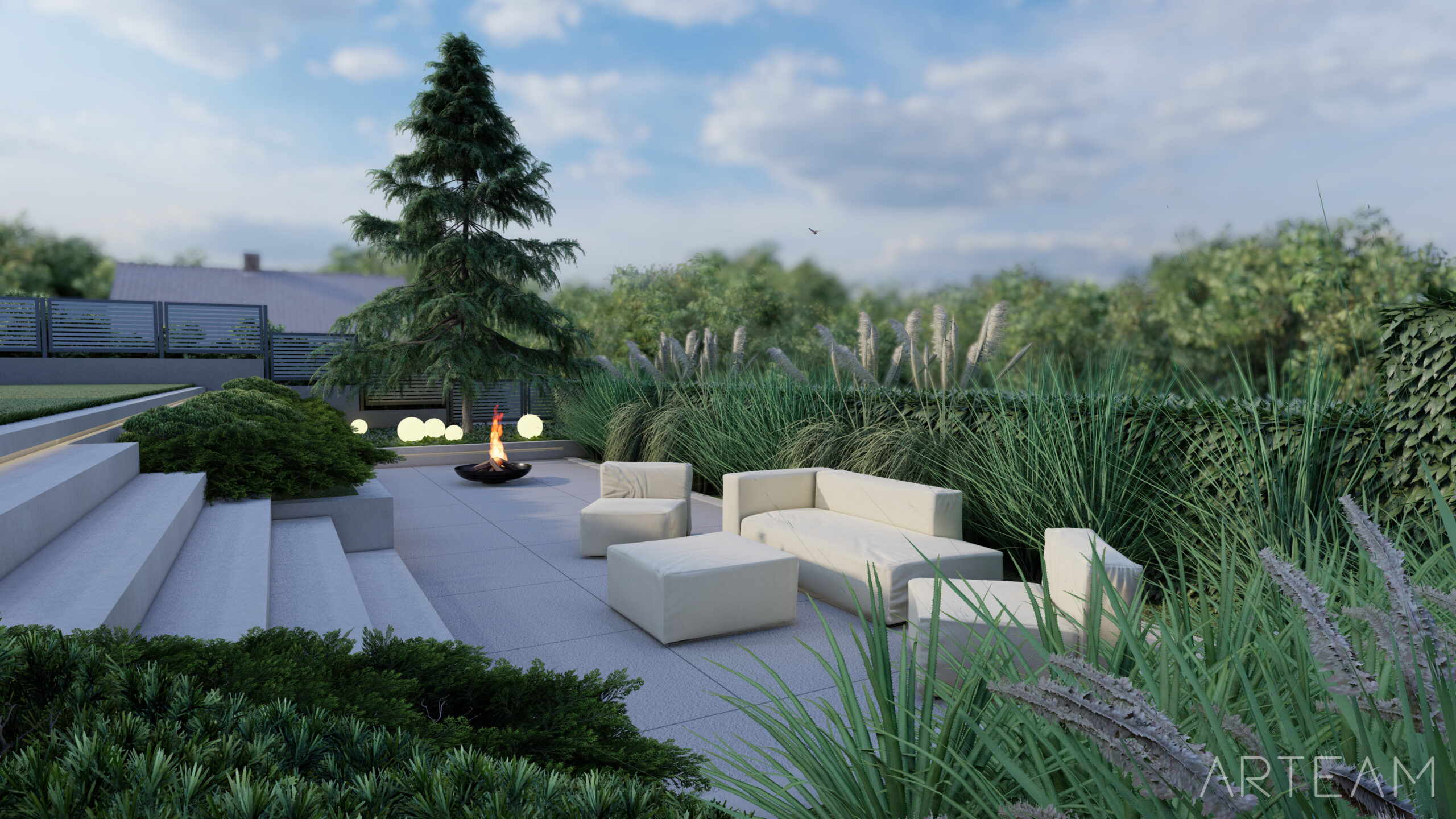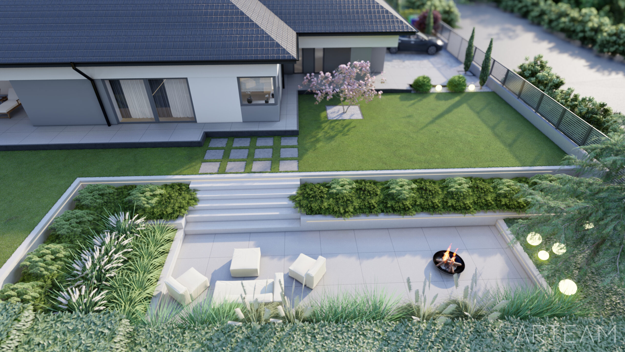 Głównym punktem całego założenia jest plac wypoczynkowy w zagłębieniu terenu otoczony roślinnością oraz oświetleniem LED na murkach oporowych.