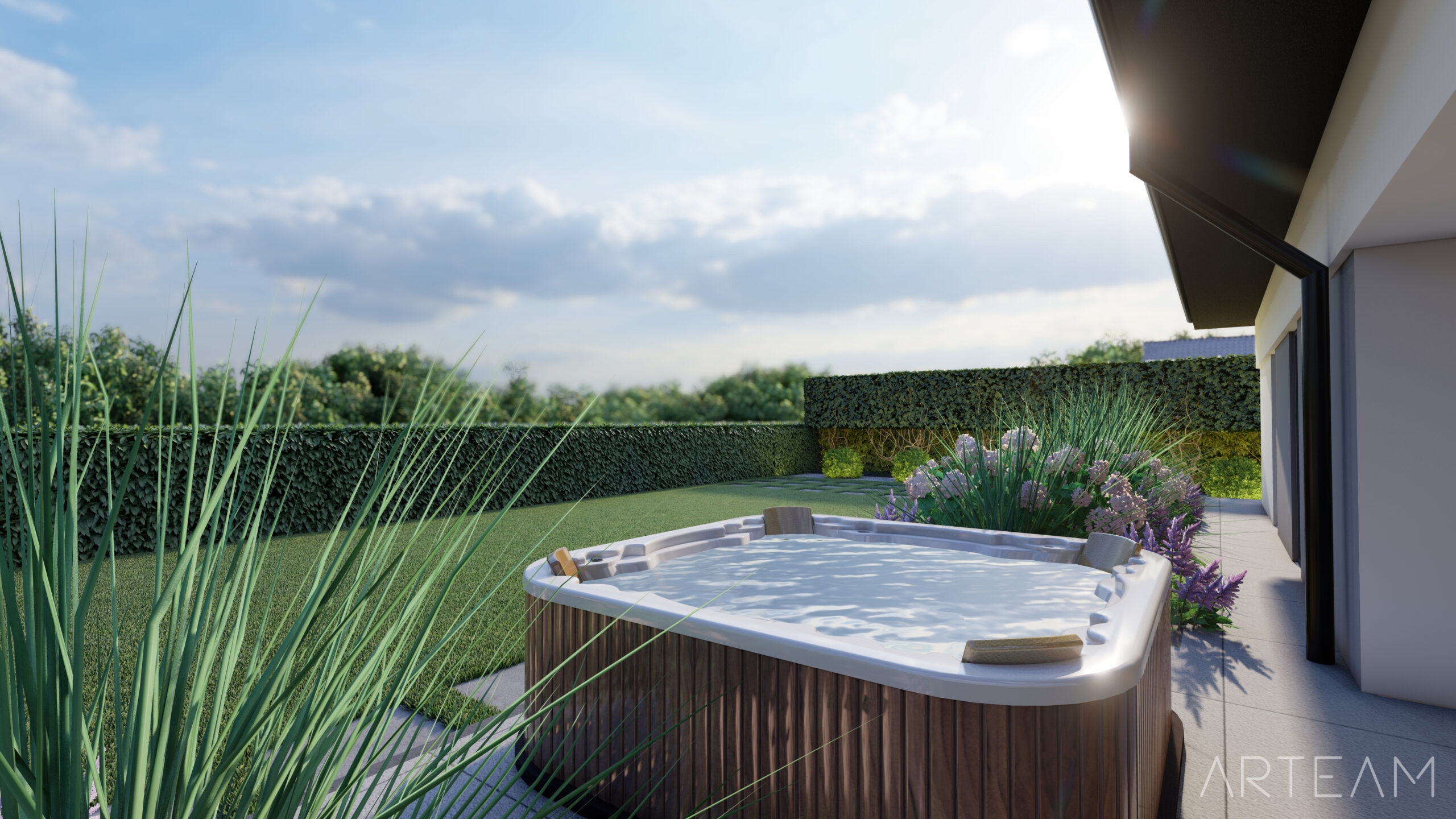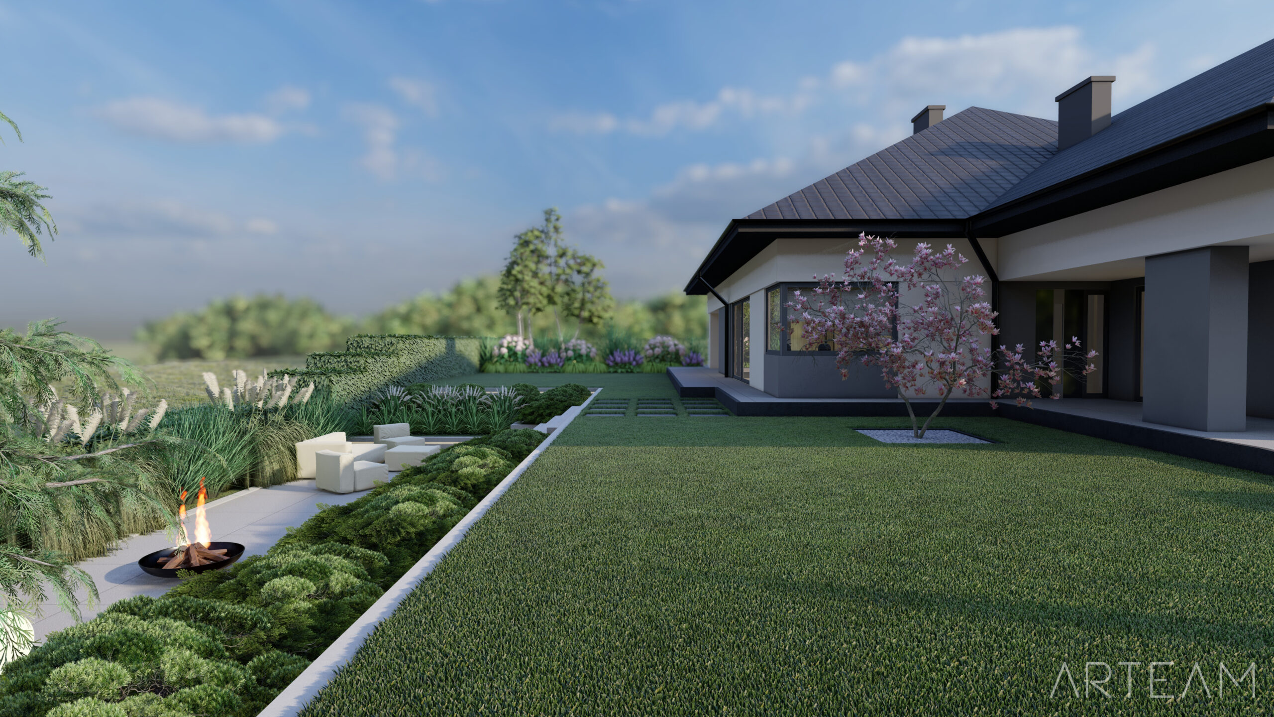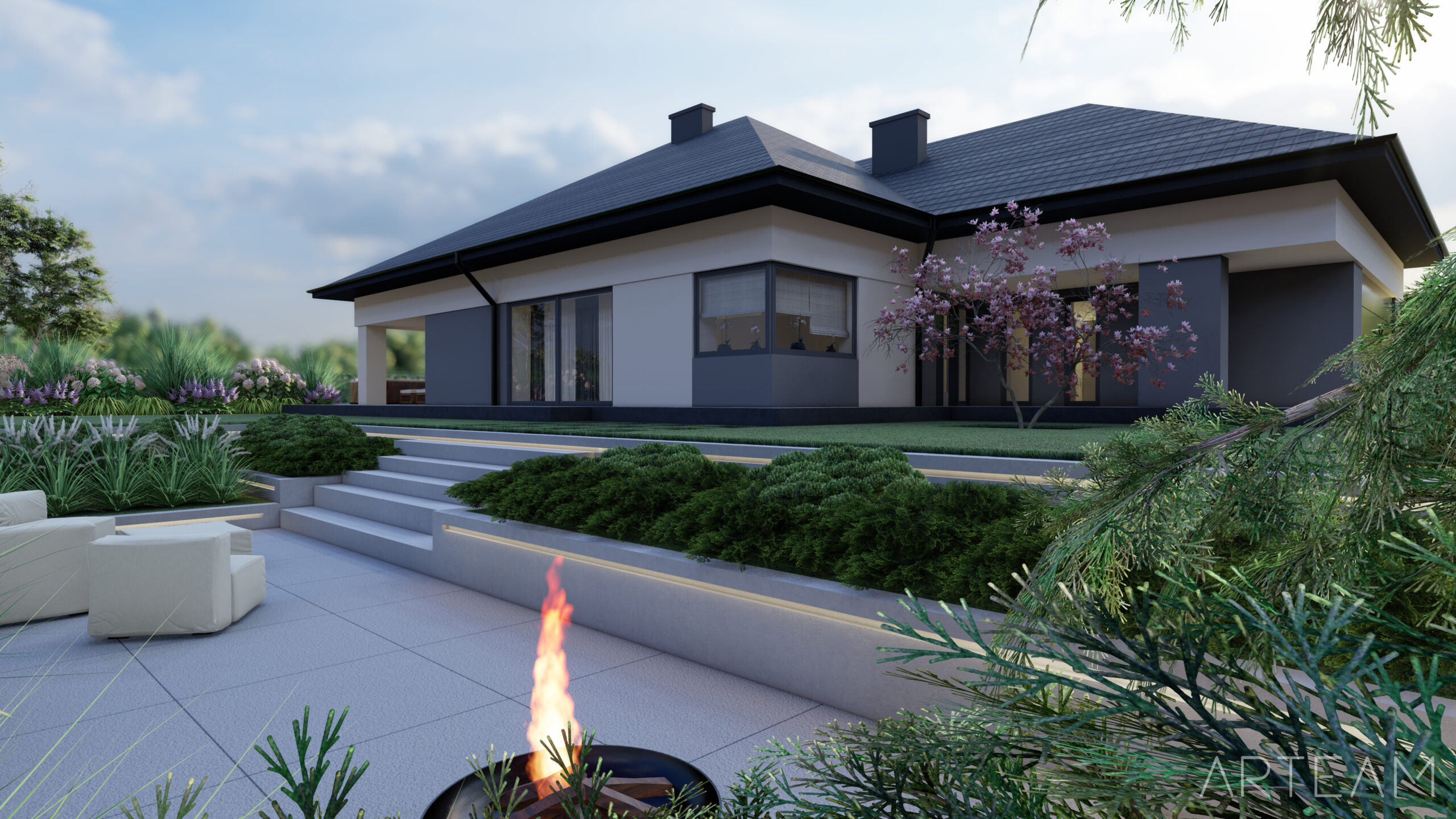 Głównym punktem całego założenia jest plac wypoczynkowy w zagłębieniu terenu otoczony roślinnością oraz oświetleniem LED na murkach oporowych.