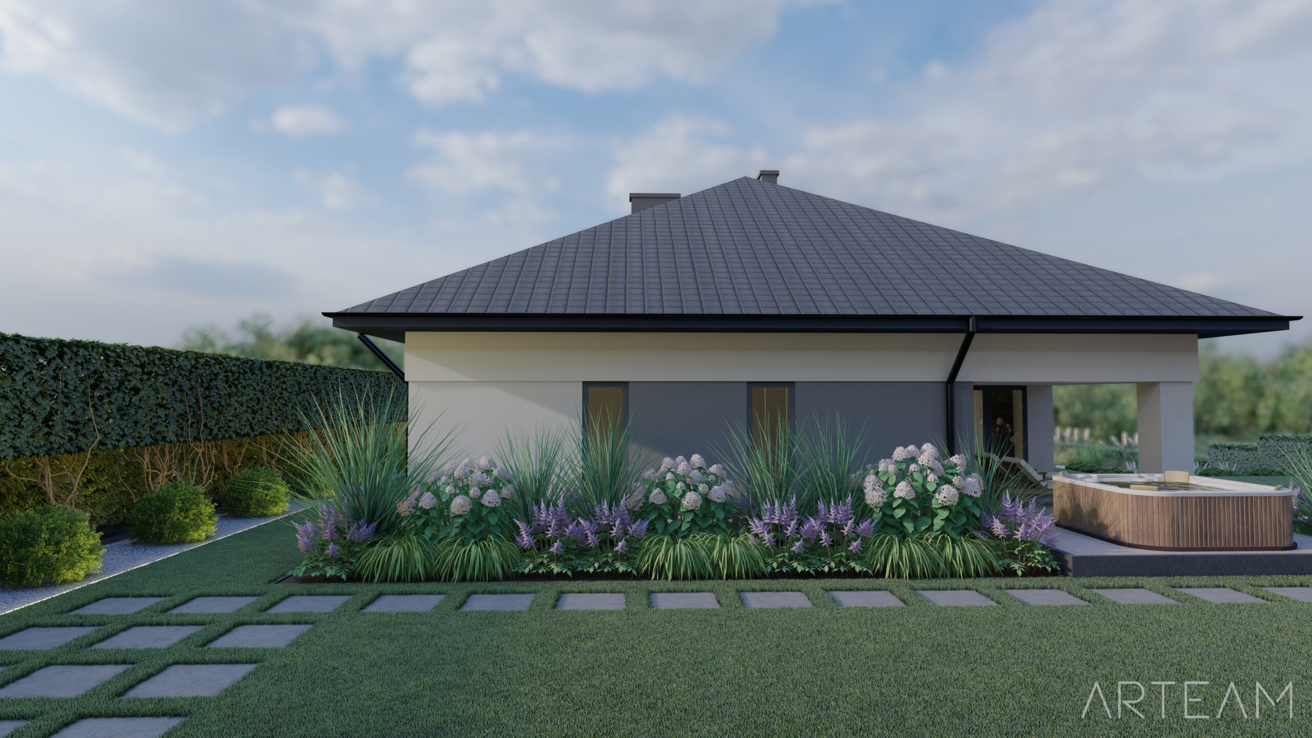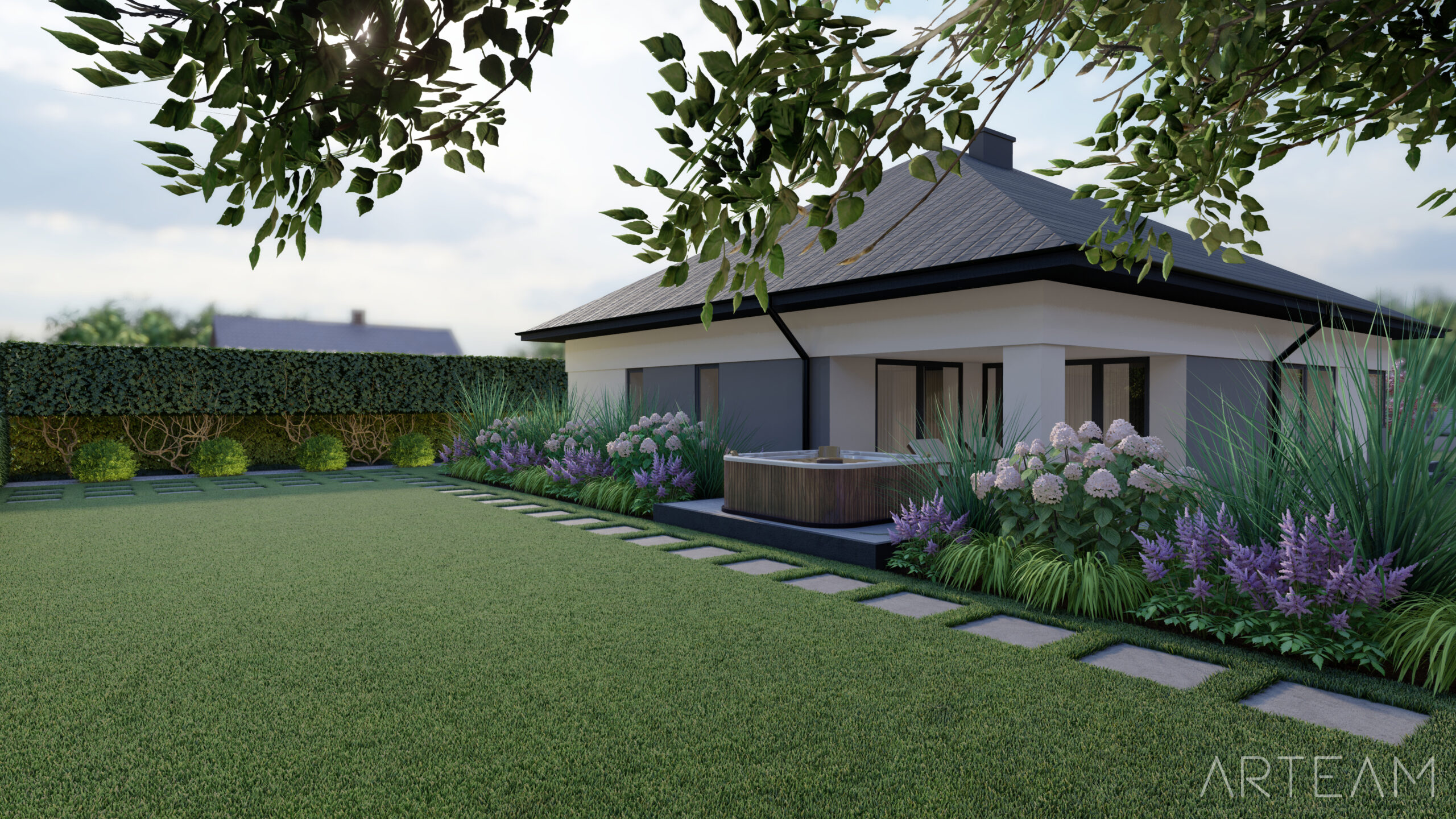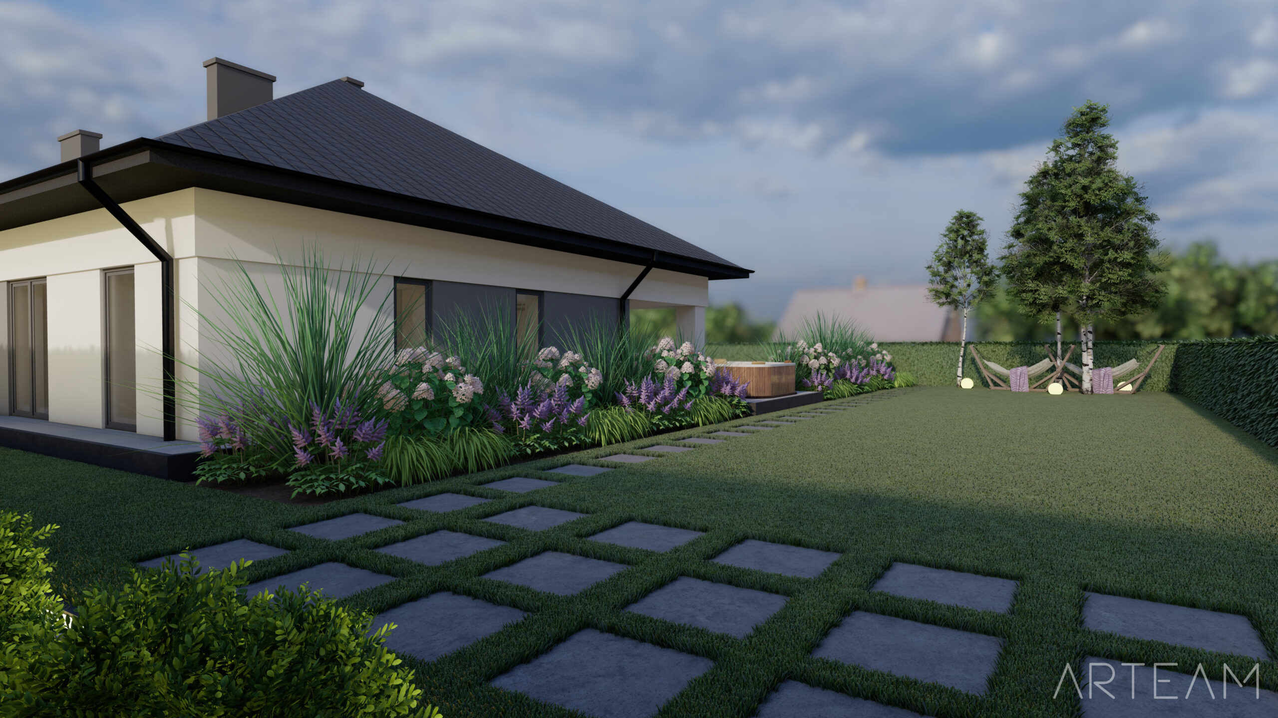Do poszczególnych stref prowadzą betonowe płyty tworzące przy okazji miejsce na dodatkowe elementy architektury ogrodowej.