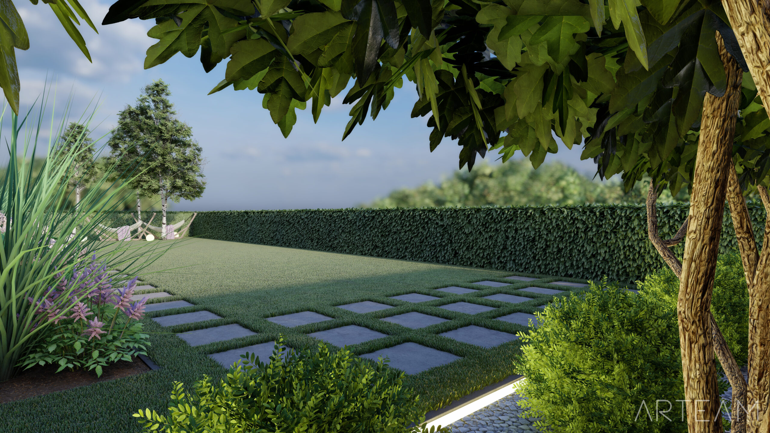 Dodatkowa strefa wypoczynkowa została zaprojektowana w zacisznym miejscu pod drzewami z przestrzenią na hamaki bądź leżaki oraz dla stworzenia nastrojowego klimatu zaplanowane zostały tam kule oświetleniowe.