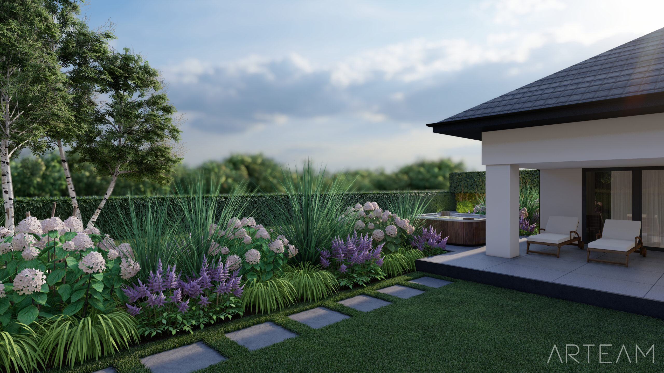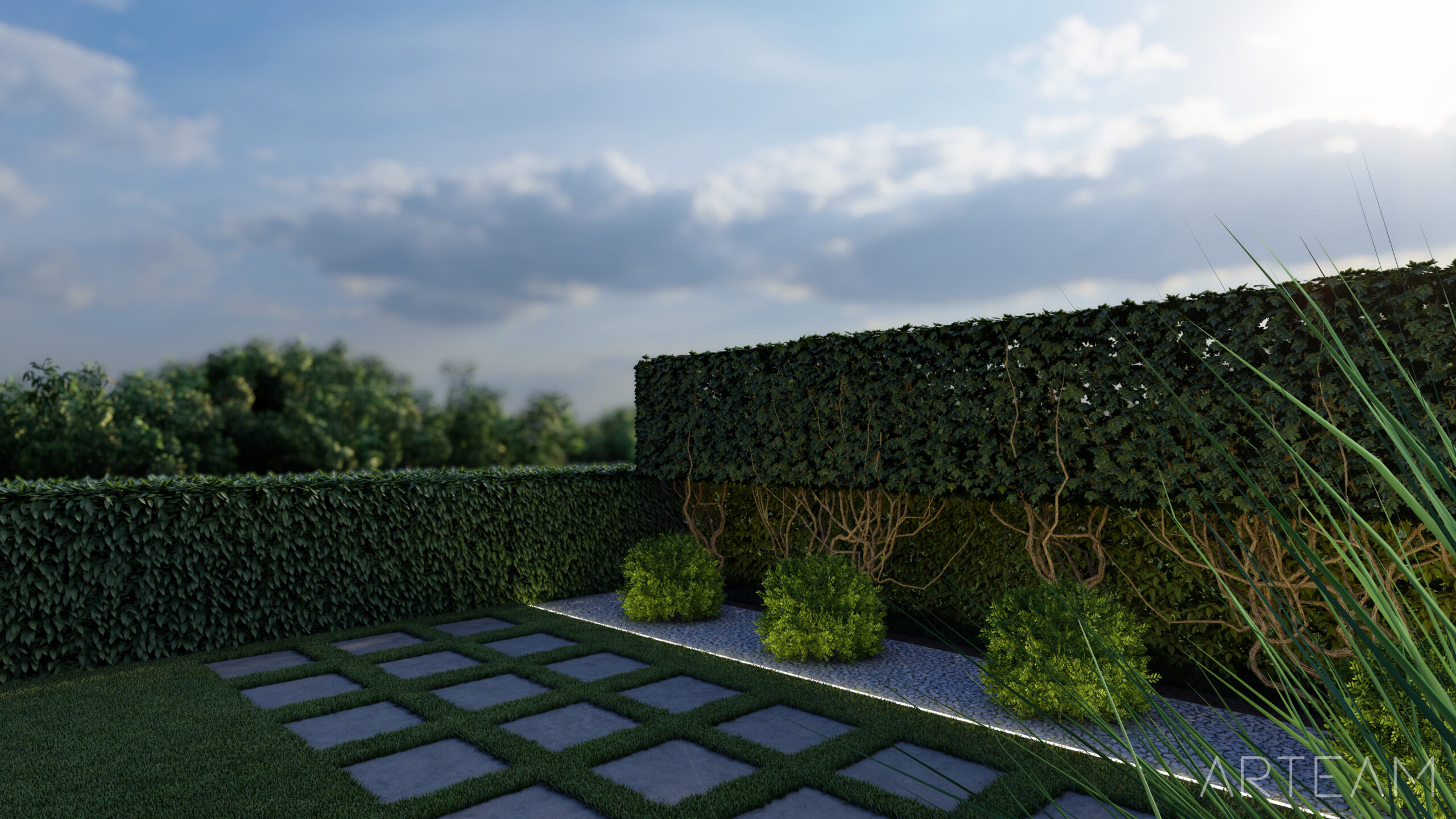 Od północnej strony działki zdecydowaną barierą stanowiącą ogrodzenie jest uformowany blok grabowy podświetlany taśmą LED, który urokliwie wygląda podczas długich wieczorów.