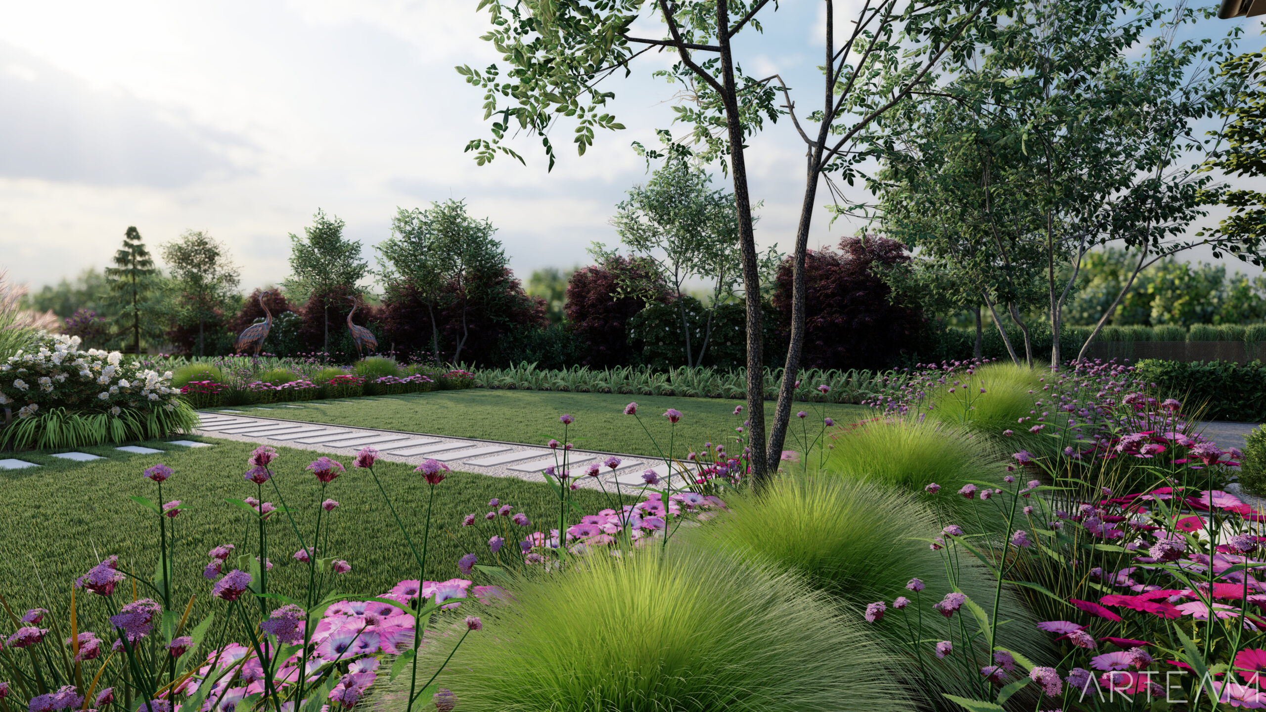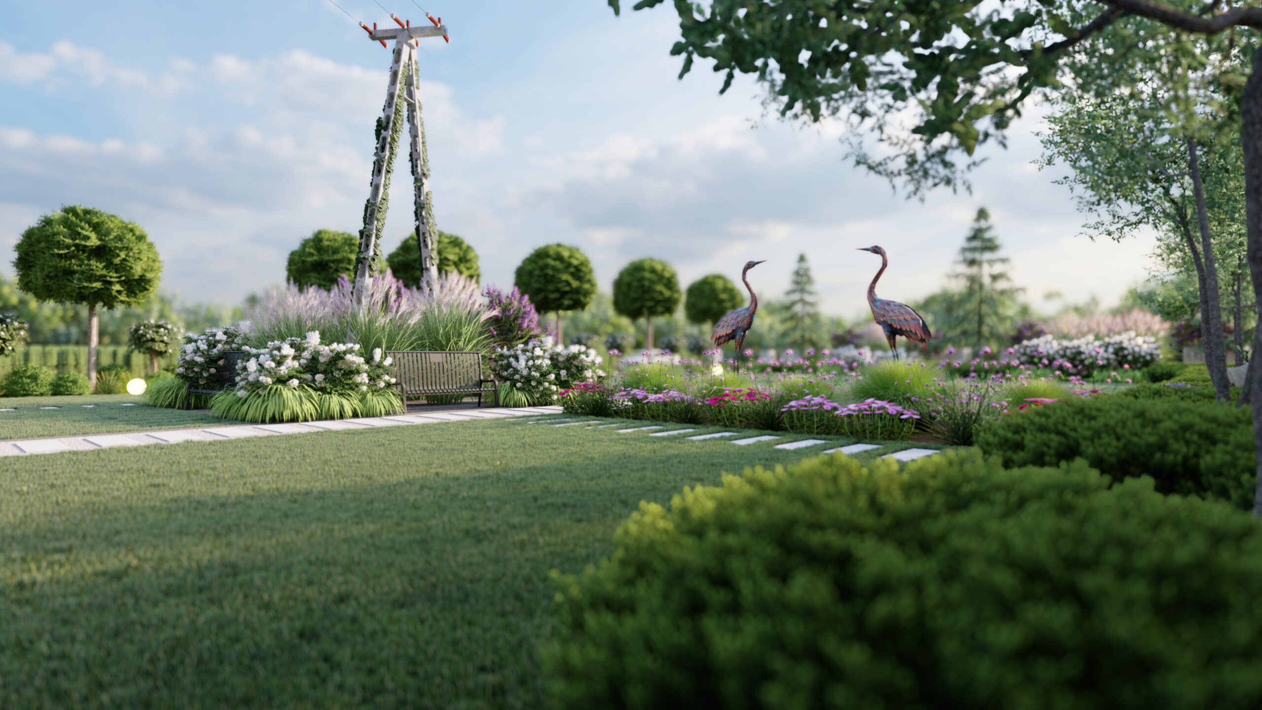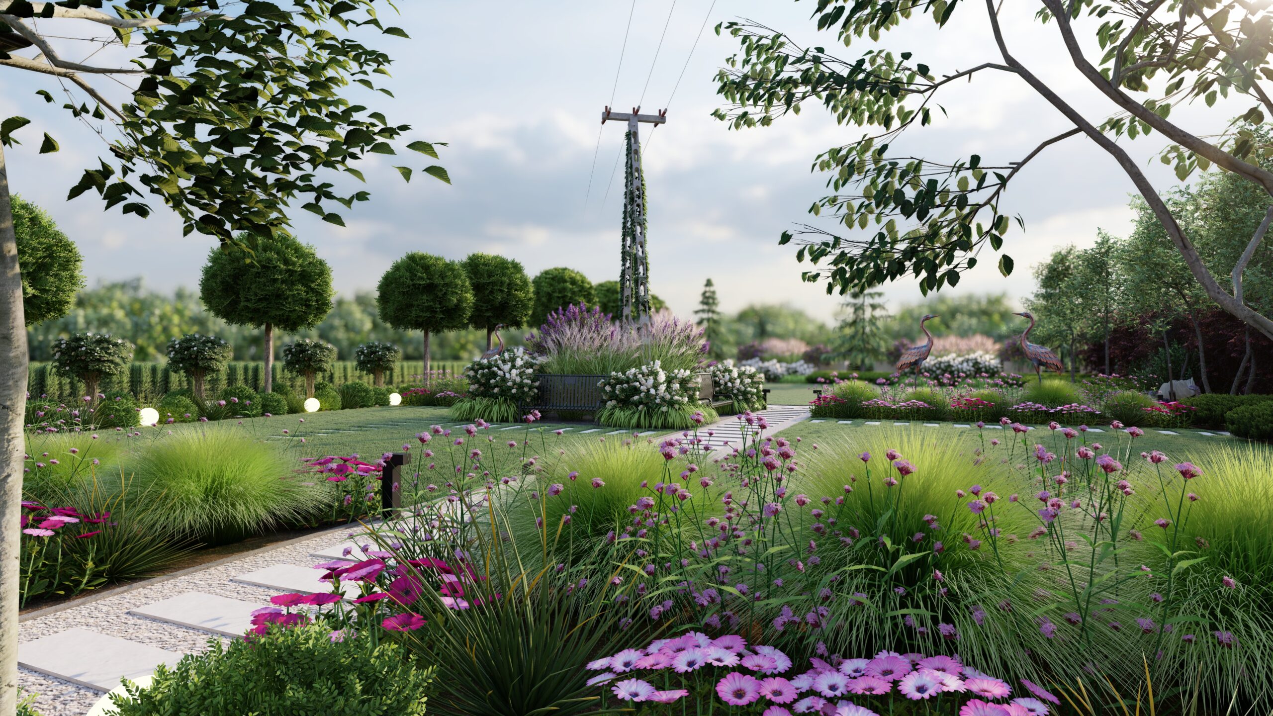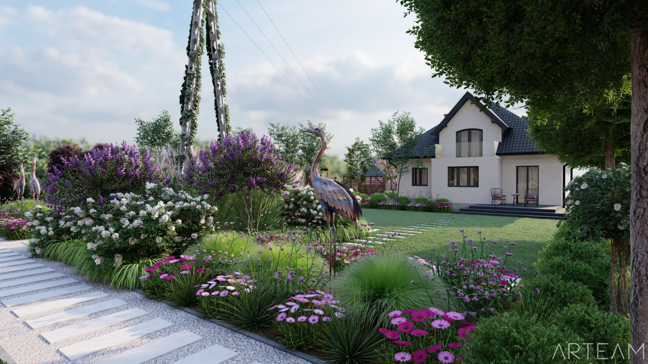 Jak widzicie, daliśmy sobie z nim radę💪💪 i wkomponowaliśmy w bujną rabatę z ciekawych odmian m.in. miskantów, lilaków i hortensji. 🌷🌷 By dodać charakteru ogrodowi wprowadziliśmy element rzeźby, który na pewno dostrzeżecie na wizualizacjach.🐦🐦
