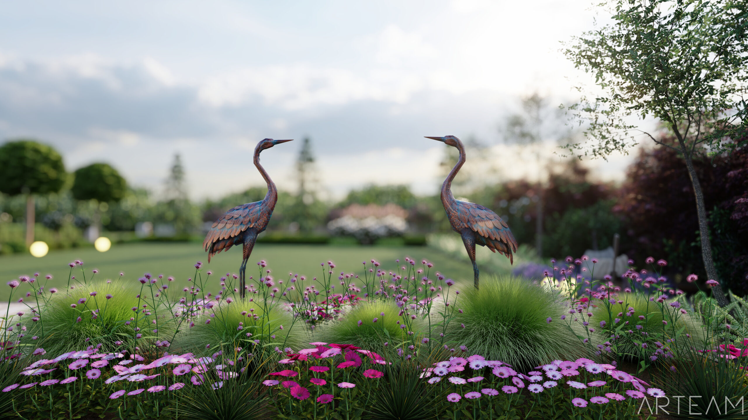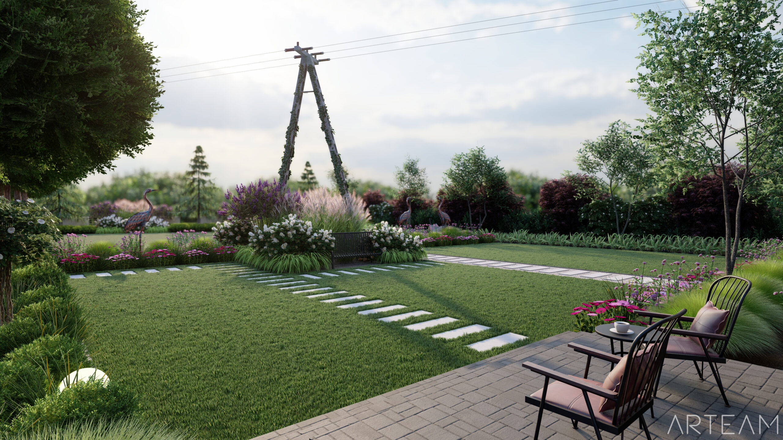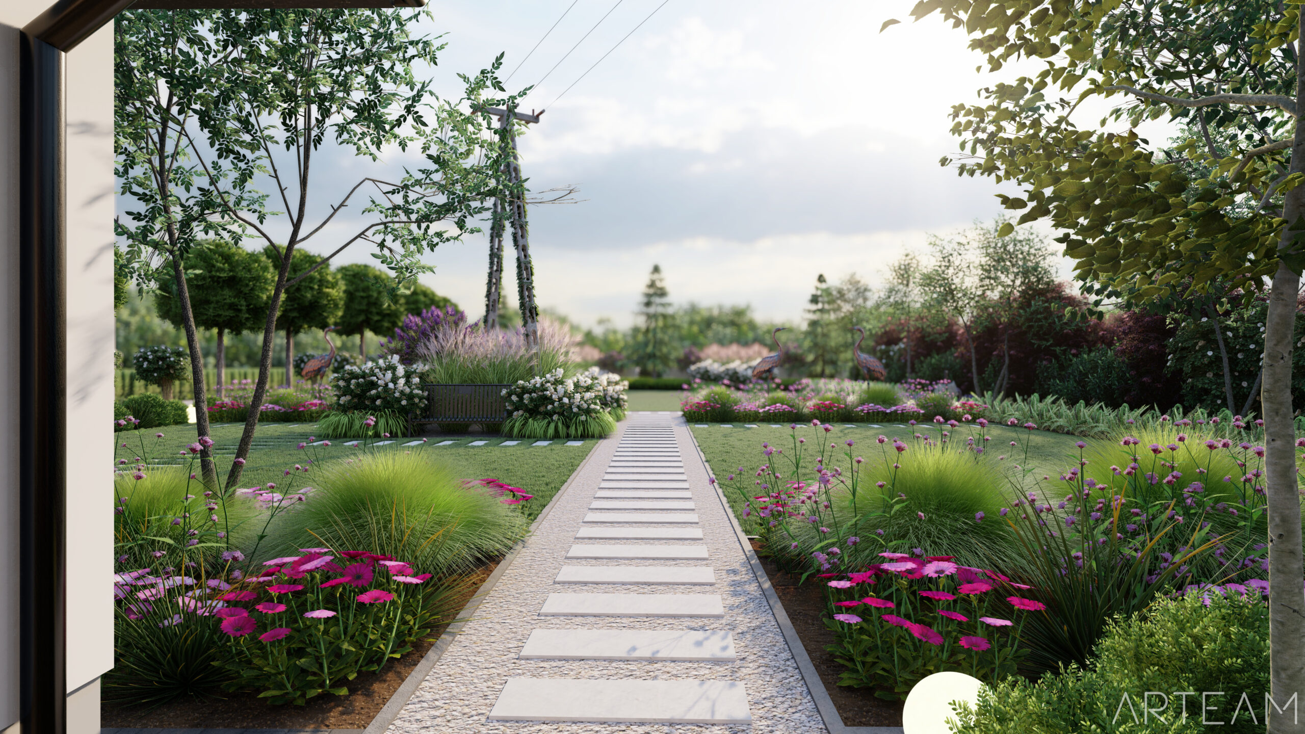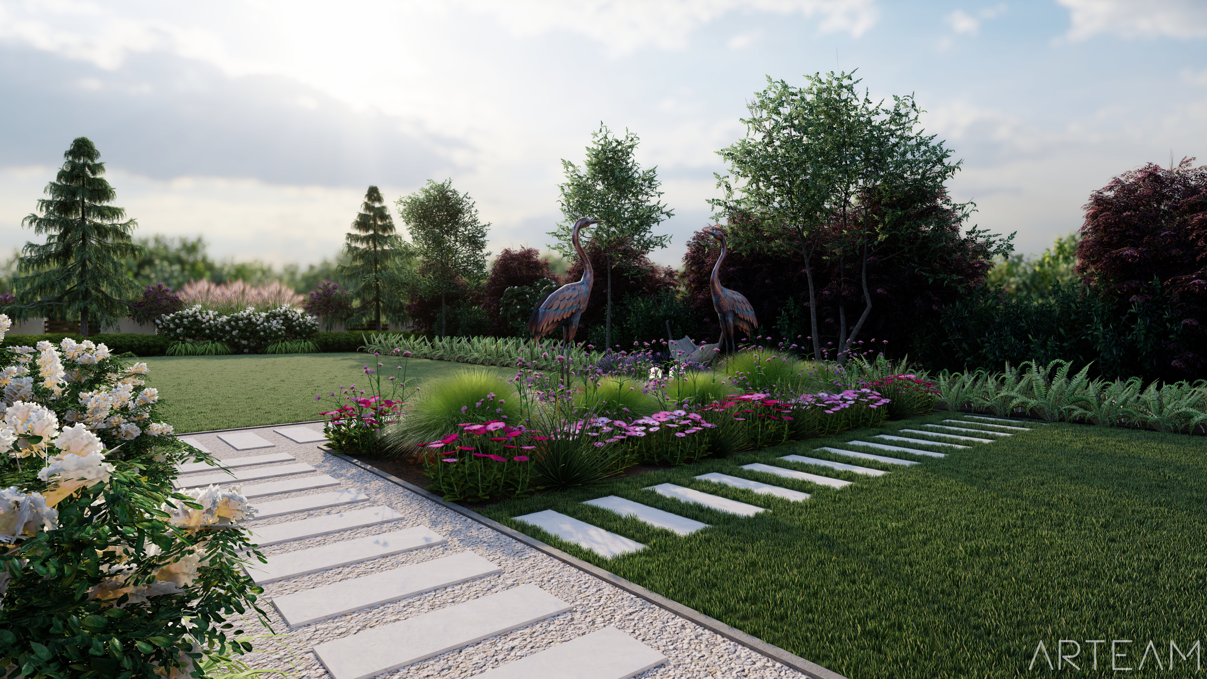Jak widzicie, daliśmy sobie z nim radę💪💪 i wkomponowaliśmy w bujną rabatę z ciekawych odmian m.in. miskantów, lilaków i hortensji. 🌷🌷 By dodać charakteru ogrodowi wprowadziliśmy element rzeźby, który na pewno dostrzeżecie na wizualizacjach.🐦🐦