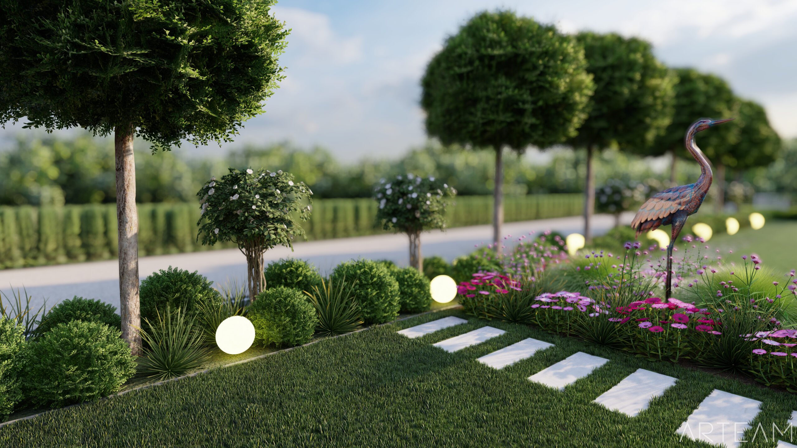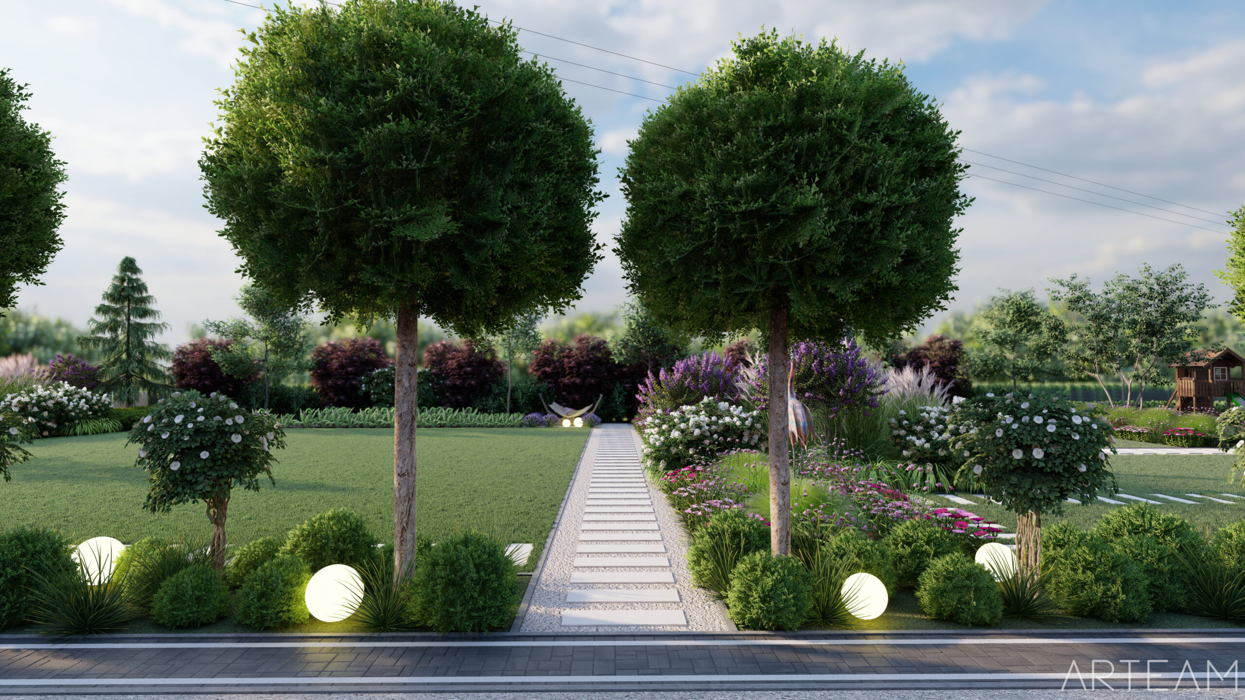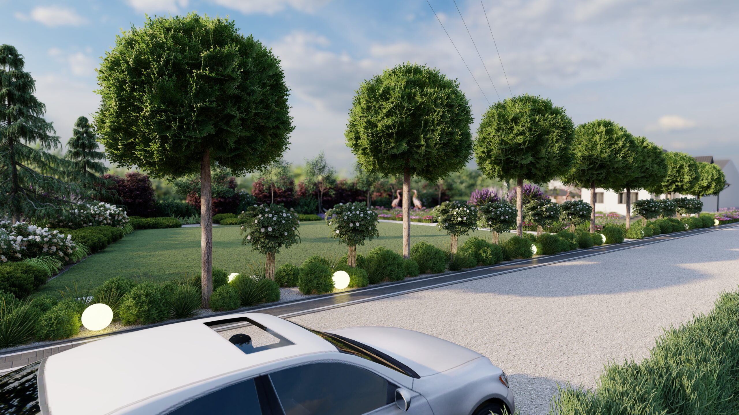 Cały teren zyskał więcej kolorów oraz kształtów. 🌸🌸Wjeżdżając na posesję witają nas żywotniki odpowiednio ostrzyżone wraz z kulami oświetleniowymi, które razem wieczorem tworzą niesamowity efekt wizualny.🌿🌿 Kule pojawią się także w innych miejscach w ogrodzie- wypoczynkowych oraz rekreacyjnych. 🌼🌼