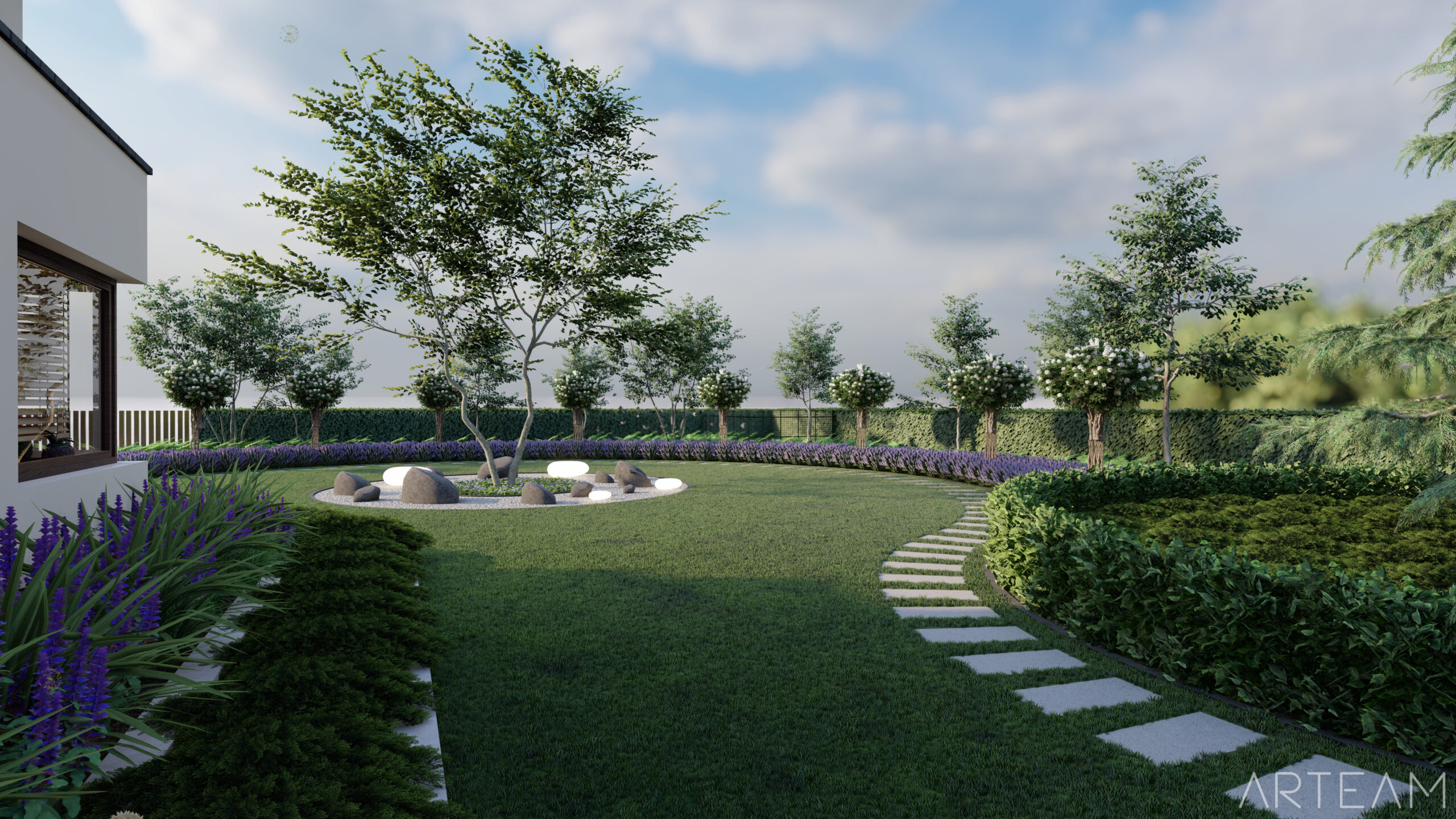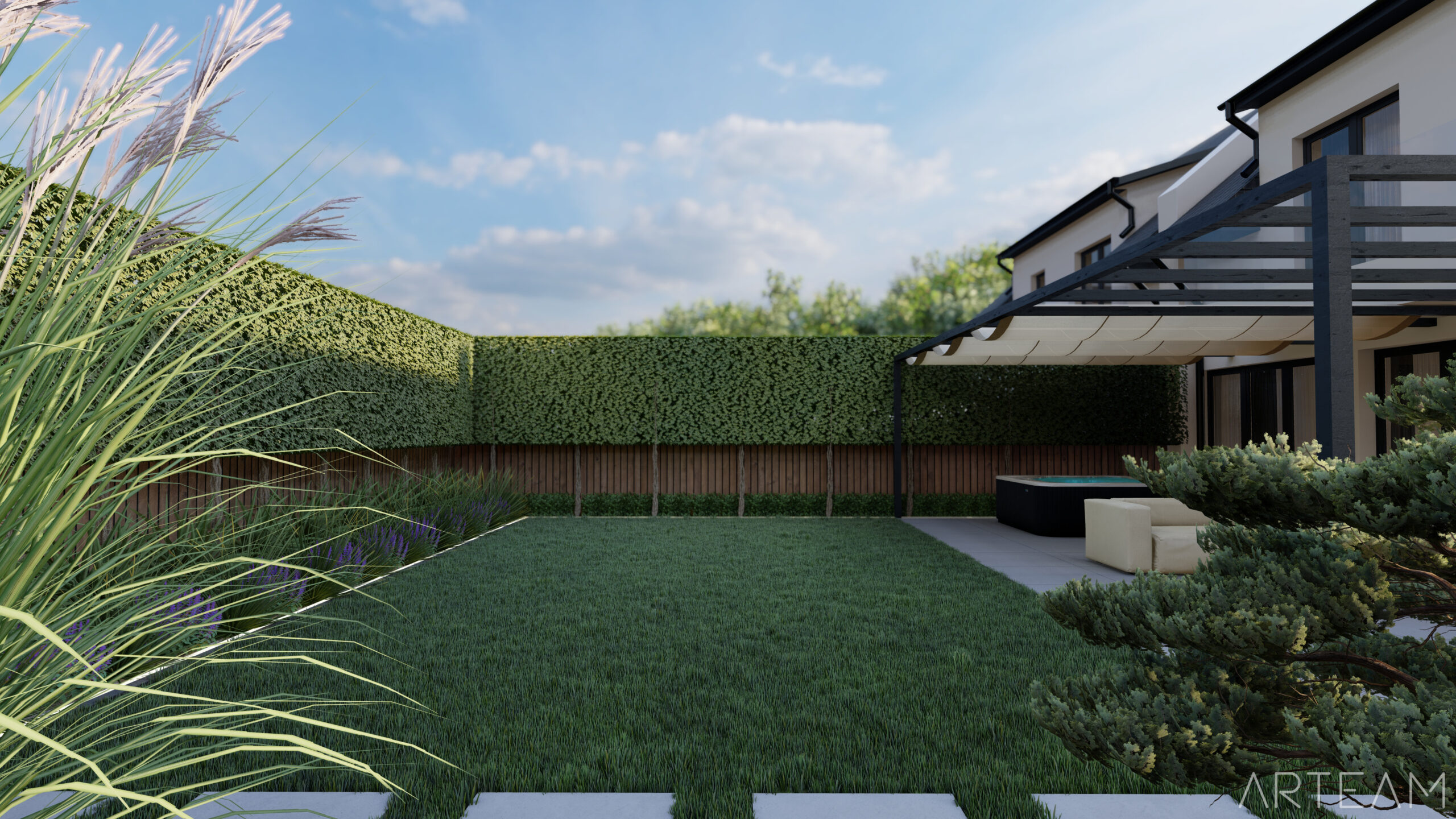 W projekcie zostały wykorzystane ekrany grabowe tworzące wysokie i gęste ogrodzenie, które idealnie sprawdzi się w przypadku sąsiadów o nadmiernej wnikliwości.