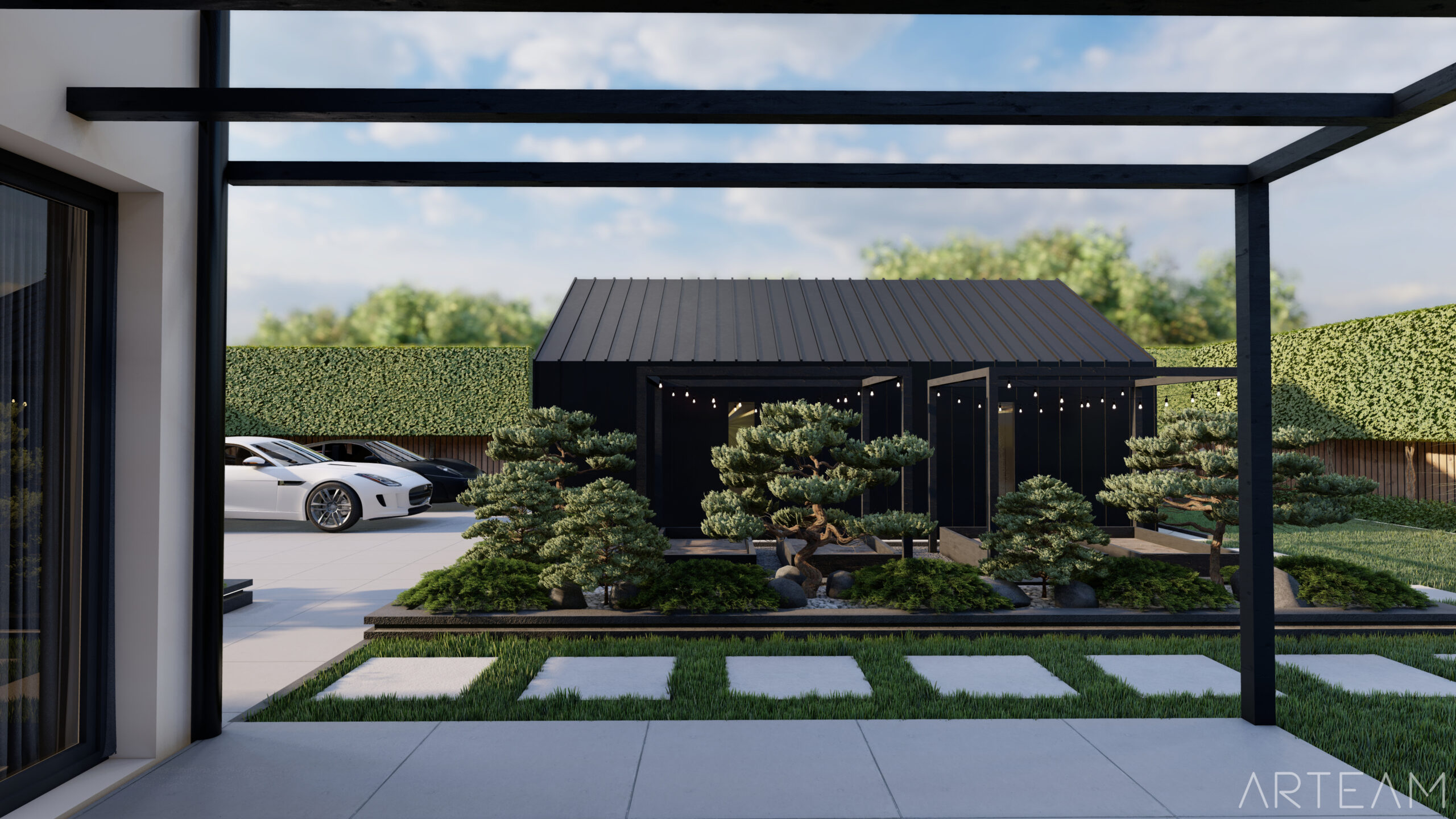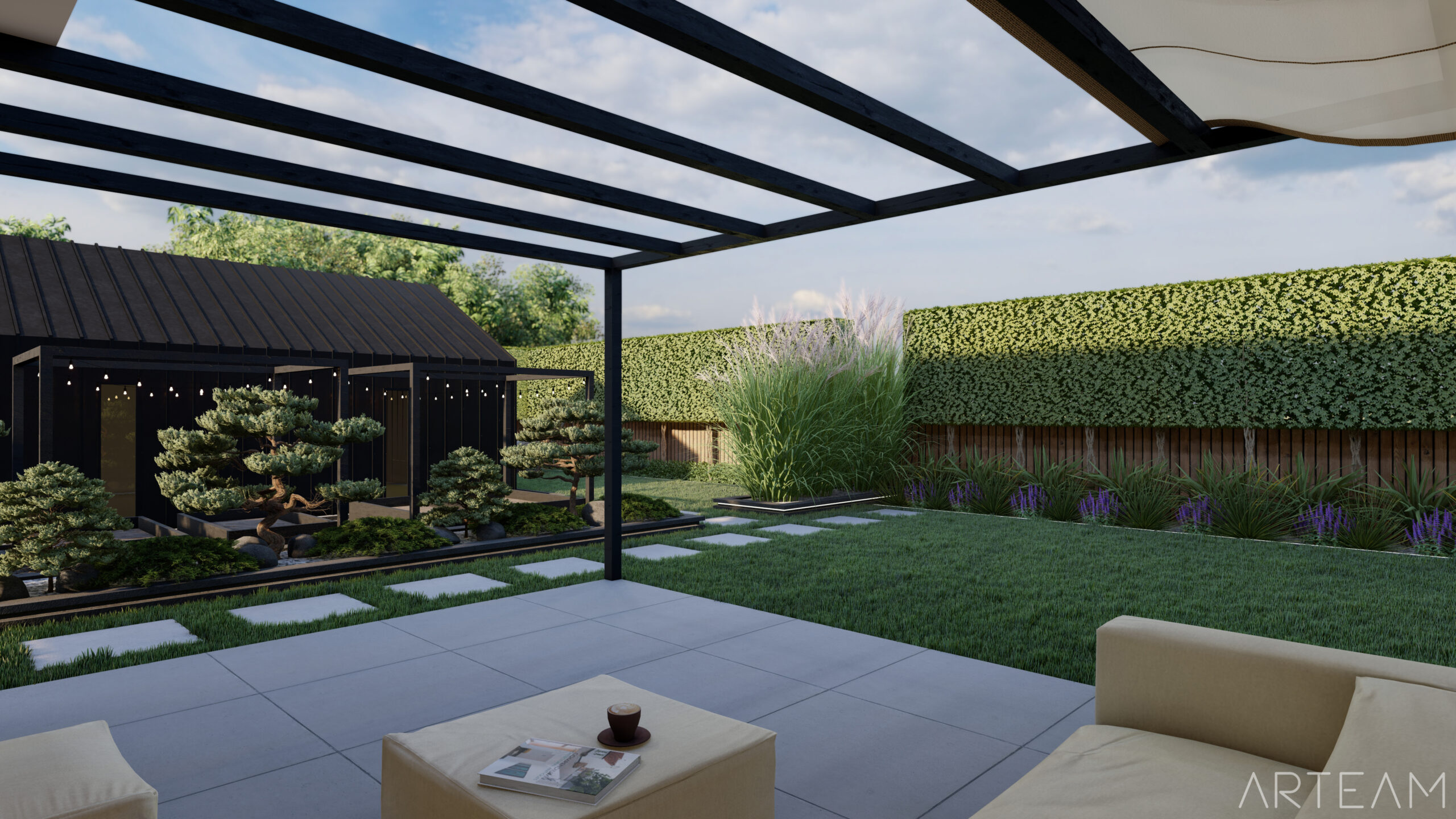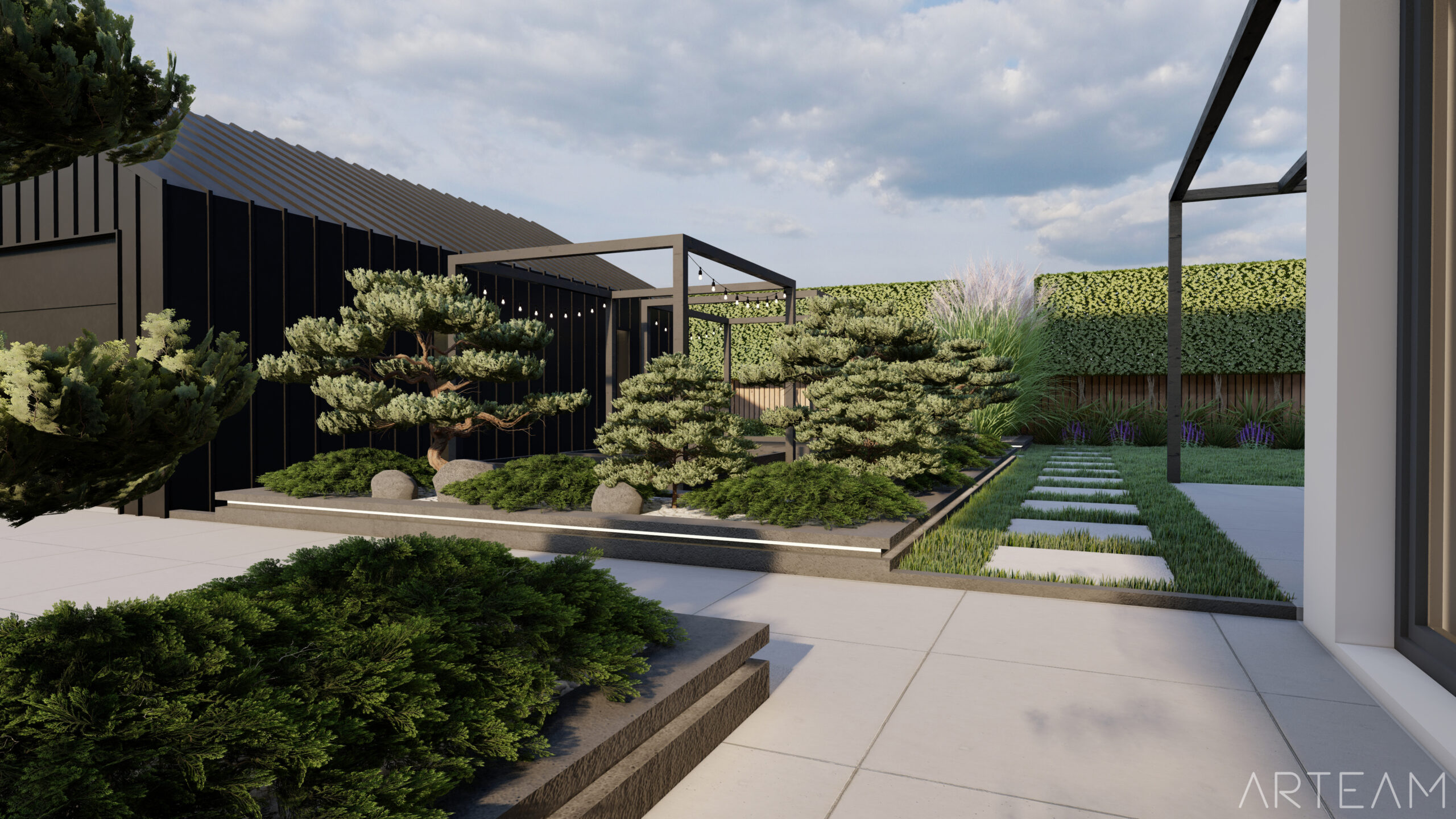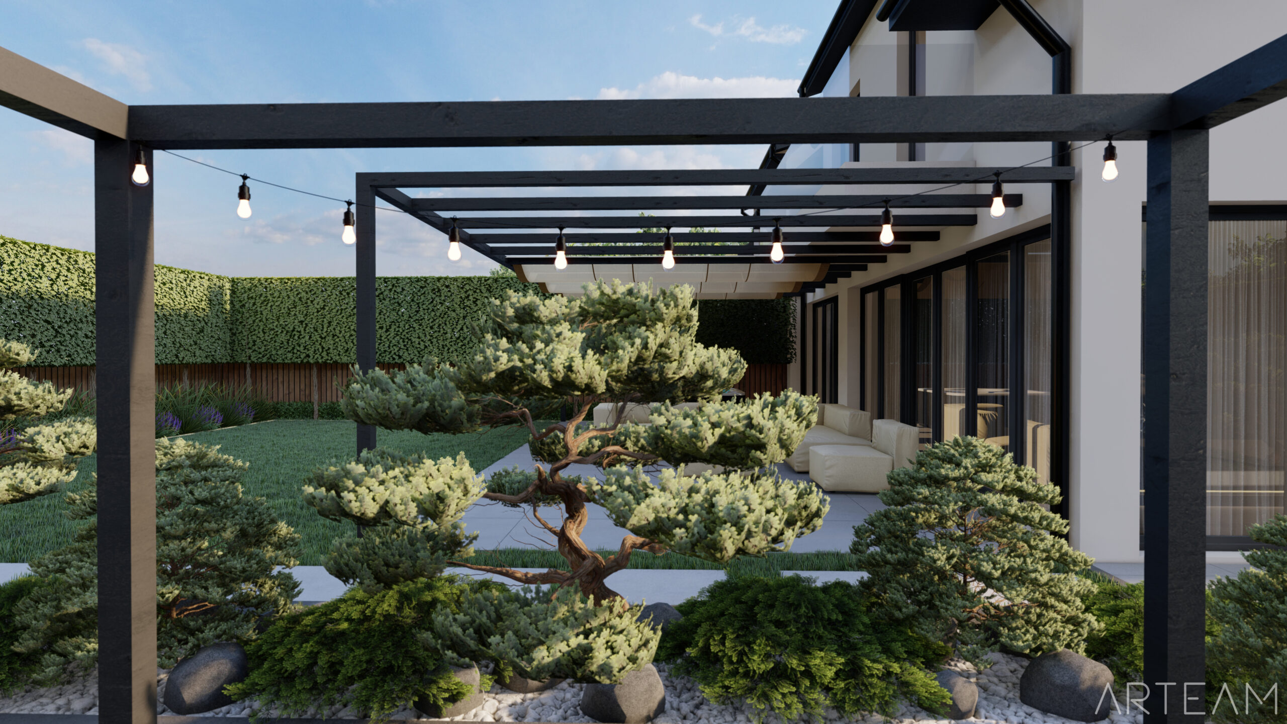 W tym przypadku zastosowana została sosna czarna (Pinus nigra), która wpasowuje się w nasz klimat i jest mrozoodporna.